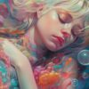 A luminous unicorn, mane and tail dissolving into ribbons of Lavender, plunges headfirst through a swirling vortex of bubblegum-pink clouds. Miniature castles, rendered in soft golds and rose, punctuate the cloudscape, while spherical planets—some resembling geodes—float in a Turquoise sky. The unicorn’s form is highly polished, reflecting a warm, internal glow, contrasting with the matte texture of the surrounding clouds. Streaks of Peach and Gold cascade downwards, suggesting a trail of stardust. The composition is dynamic, emphasizing vertical motion and a sense of otherworldly joy.