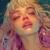 A close-cropped portrait depicts a woman with intensely focused eyes and a melancholic expression. Streaks resembling cracked porcelain or dissolving paint cascade down her face, contrasting with the sharp, defined linework of her features and hair. The cool, high-contrast grayscale palette emphasizes the texture of wet strands and the delicate geometry of the fractured patterns. A thin choker necklace and subtle lace detailing hint at vulnerability. The composition draws the eye to the slight parting of her lips, suggesting a suppressed emotion.