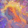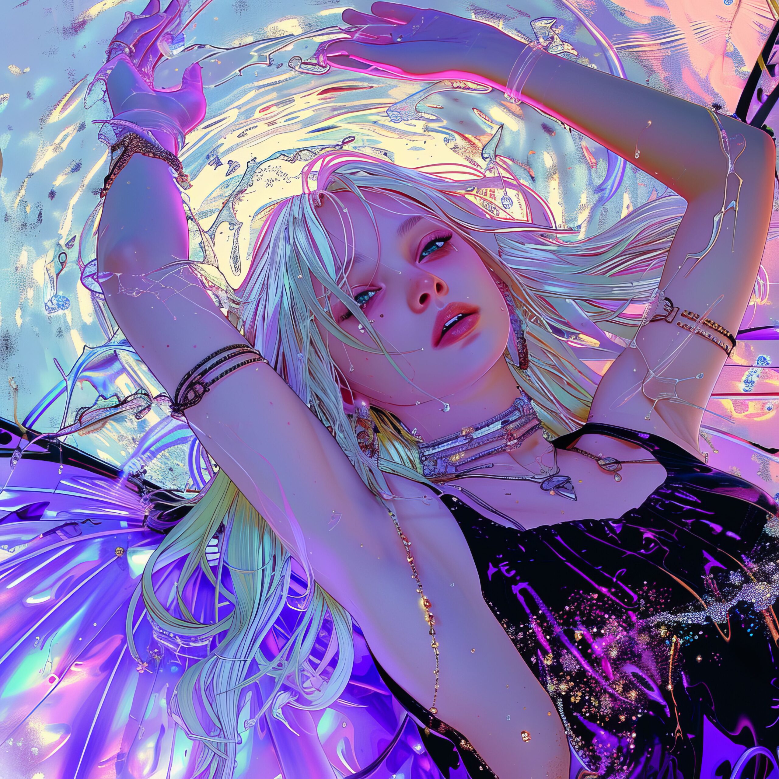 A close-cropped portrait of a woman with flowing platinum blonde hair, her gaze directed slightly upward. Her skin has a soft, airbrushed quality, contrasted by sharp, angular lines defining her collarbone and jaw. She wears multiple layered necklaces and bracelets. The background is a swirling vortex of fractured light and color, resembling broken glass or oil slicks, dominated by cool Lavender and hot Pink hues. A subtle, cosmic pattern adorns her Black top. The overall effect is ethereal and dynamic, suggesting a moment of transformation.