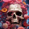 A hyperrealistic skull, rendered in smooth, pearlescent White, is almost entirely obscured by a dense explosion of bulbous, cartoonish creatures in shades of Pink, Coral, Sky Blue, and Gold. The creatures, resembling playful, amorphous blobs with wide eyes, swarm the skull’s eye sockets, teeth, and cheekbones. Dramatic, directional lighting emphasizes the skull’s bone structure and the glossy texture of the surrounding forms, creating a stark contrast between the macabre subject and the whimsical, vibrant palette. The overall effect is a chaotic, energetic composition that evokes a sense of both fascination and unease.