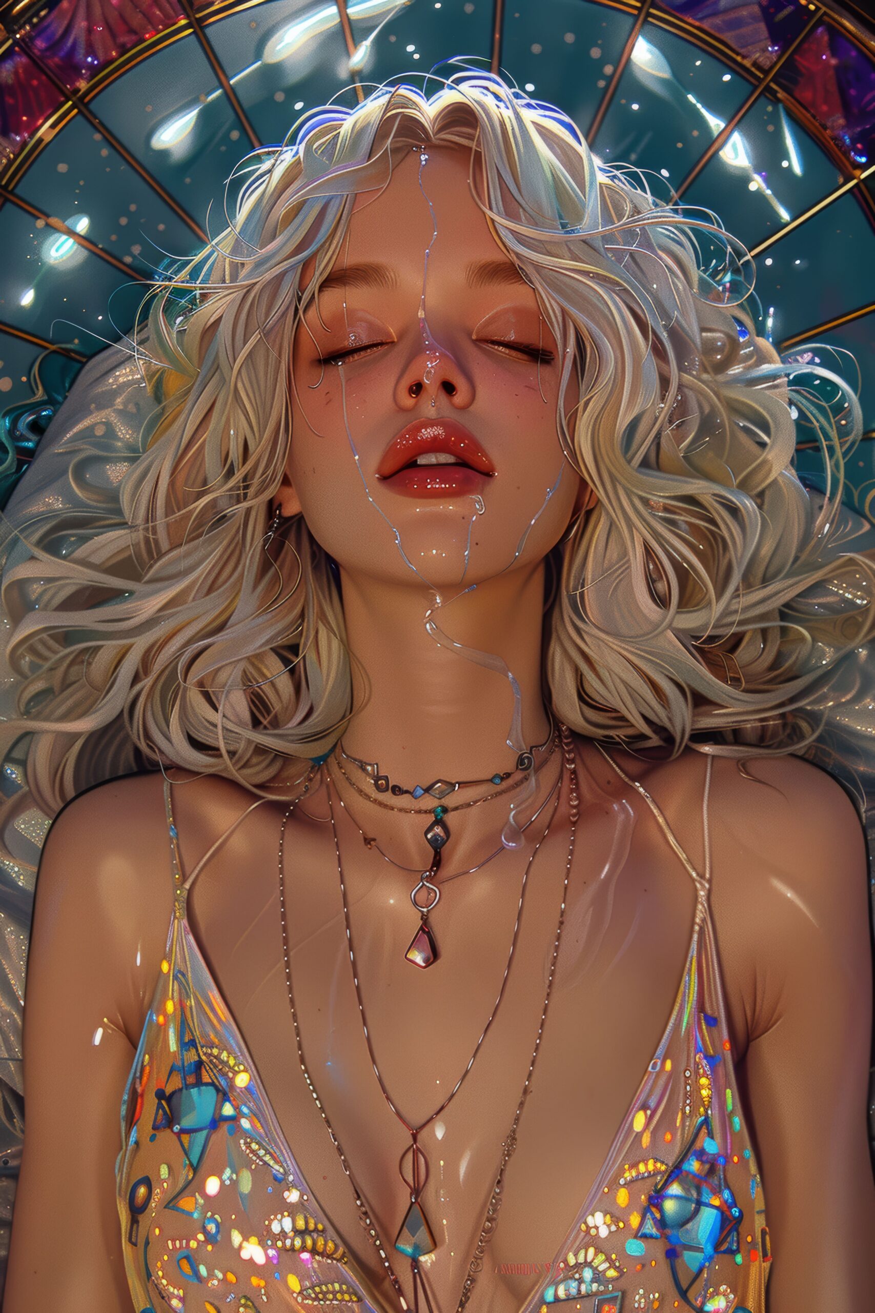 A close-up portrait of a woman with closed eyes, bathed in a cool, ethereal light. Her platinum blonde hair cascades around her face, interwoven with shimmering, translucent strands resembling liquid silver. She wears a fragmented, iridescent top that catches the light like scattered jewels. The composition is vertically oriented, emphasizing the delicate curve of her neck and the multiple layered necklaces. A blurred, arched structure above suggests a cathedral window or cosmic portal. The overall palette is cool-toned, dominated by blues, violets, and pearlescent whites, creating a dreamlike, otherworldly atmosphere.