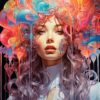 A close-cropped portrait of a woman with cascading, silver-streaked hair that dissolves into a swirling cloud of butterflies. The butterflies, rendered in vibrant hues of Coral, Pink, Turquoise, and Indigo, cluster around her face and shoulders, creating a halo effect. Her skin has a pearlescent sheen, and her gaze is directed downwards with a melancholic expression. The background is a deep Asphalt, emphasizing the cool tones of the hair and the warm palette of the insects. Delicate floral vines intertwine with the butterflies, suggesting a symbiotic relationship between nature and beauty. The overall effect is dreamlike and ethereal.
