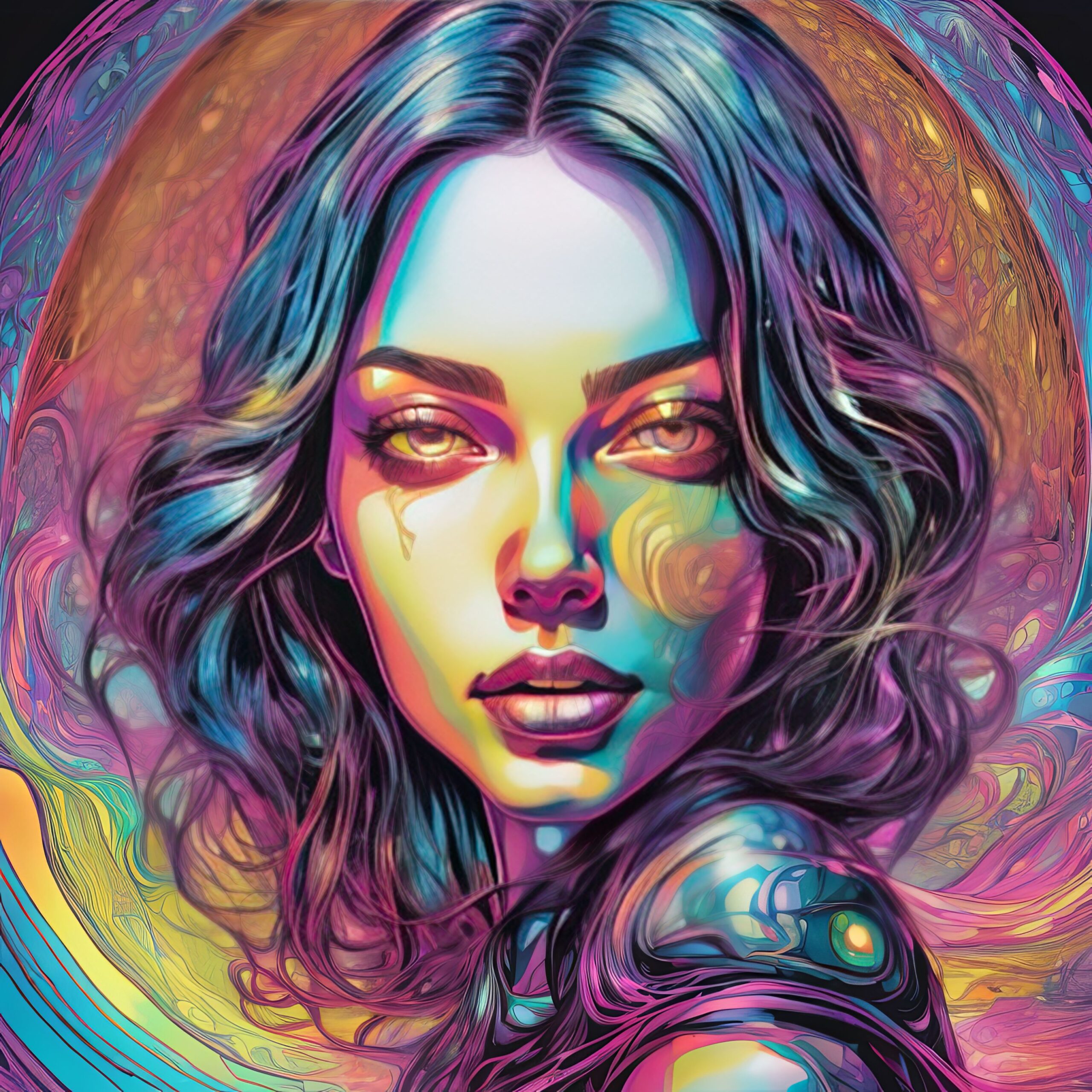 A close-cropped portrait of a womanβs face is enveloped in swirling, iridescent energy. Her gaze is direct, eyes a warm amber, and skin tones shift between lavender, rose, and gold. Below her chin, a complex, metallic structure resembling a brain or circuit board emerges, rendered in cool magenta and teal. The composition is circular, suggesting a contained universe of thought. Light appears to emanate from within the subject, creating a halo effect and emphasizing the contrast between organic form and mechanical detail. The overall effect is dreamlike and intensely vibrant.