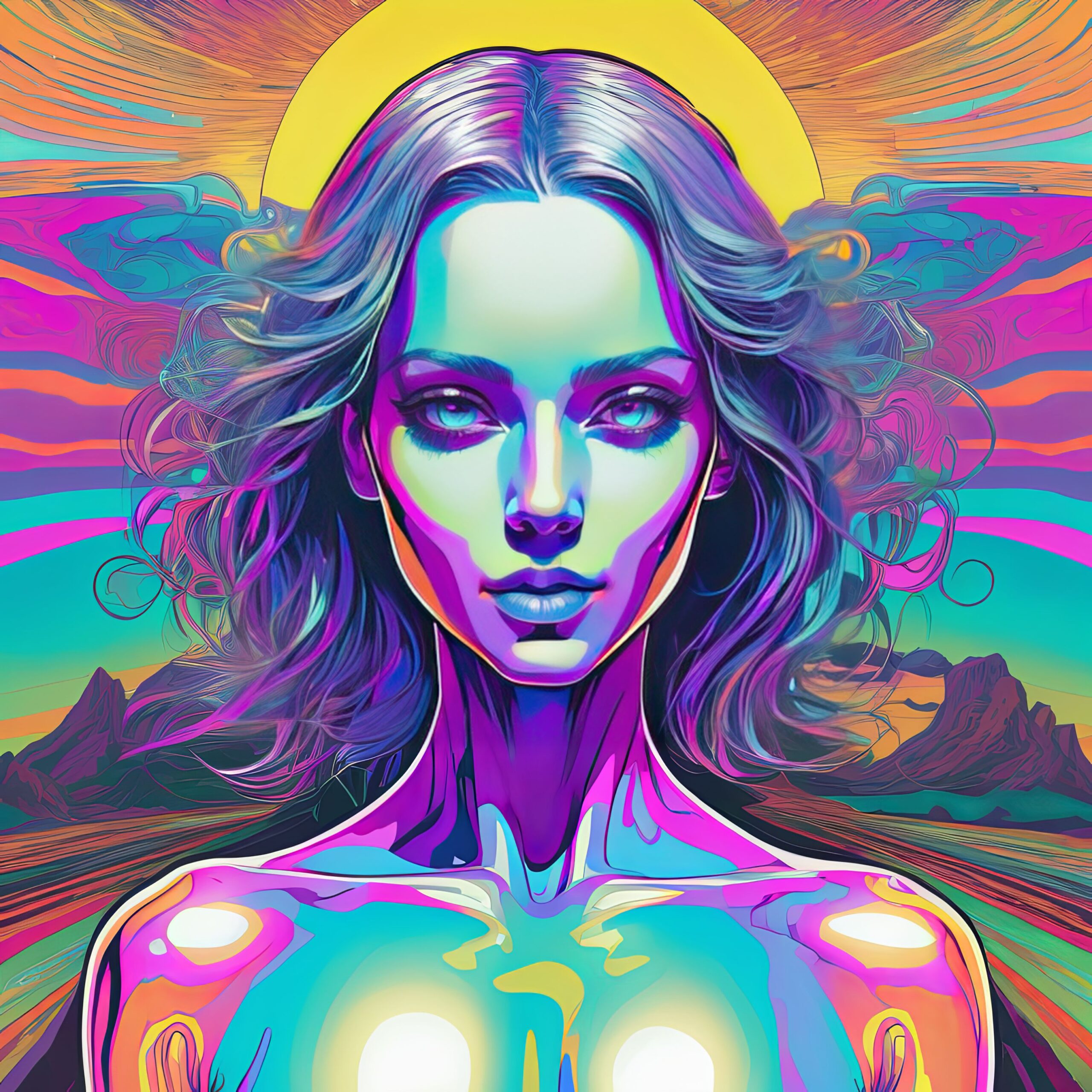 A close-cropped portrait of a woman with piercing blue eyes dominates the frame, her face rendered with hyper-realistic detail. Her skin shimmers with an iridescent, oil-slick quality, transitioning from teal to violet across her shoulders. A large, luminous golden orb floats behind her head like a halo, casting a warm glow. The background dissolves into a swirling landscape of purple and pink mountain ranges, suggesting a dreamscape. Wisps of smoke-like energy curl around her face, and the overall effect is one of ethereal power and otherworldly beauty.