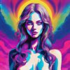 A close-cropped portrait of a womanβs face dominates the frame, rendered in a vibrant, fractured style. Her skin is a cool, pale Lavender, overlaid with angular planes of Magenta, Turquoise, and Orange. Voluminous, swirling hair, resembling energy currents, radiates outward. The eyes, a piercing Violet, draw the focus. A soft, diffuse light source illuminates the face from the upper left, creating subtle shadows. The background is a hazy blend of Pink and deep Purple, suggesting a nebula or digital space. The overall effect is a dynamic interplay of warm and cool tones, evoking a sense of otherworldly intelligence.