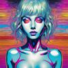 A frontal portrait of a woman with intensely saturated, swirling color gradients mapping her facial features and hair. Concentric rings of warm and cool tones—Magenta, Orange, Teal—radiate outward from her face, suggesting energy or a blossoming aura. Her gaze is direct, with subtle shadowing emphasizing cheekbones and jawline. Below her shoulders, a fragmented, robotic form emerges, rendered in similar swirling patterns, creating a cyborg-like impression. The overall effect is a fusion of organic and mechanical elements, bathed in a dynamic, almost psychedelic light.
