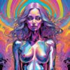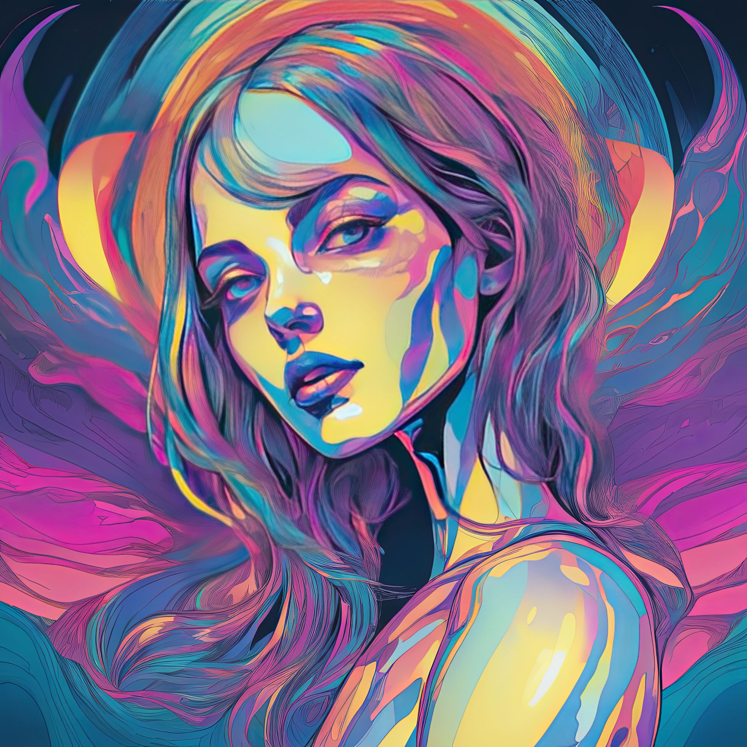 A close-cropped portrait of a womanβs face is rendered in a fractured, painterly style, resembling stained glass. Warm light emanates from her skin, contrasting with cool, swirling forms that suggest a nebula or aurora borealis. The palette is dominated by shades of Magenta, Teal, and Gold, with sharp angles defining her cheekbones and jawline. Her hair flows like liquid, merging with the surrounding cosmic energy. The overall effect is a dynamic interplay of organic and geometric shapes, evoking a sense of inner space and otherworldly beauty.