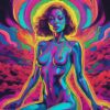 A close-cropped portrait of a womanβs face is rendered in swirling, fractured planes of color, resembling a psychedelic oil painting. Cool turquoise and violet dominate the skin tones, sharply contrasted by warm yellow highlights along the cheekbones and brow. Her gaze is direct, yet distant, set within eyes that echo the surrounding nebula-like patterns. The background explodes in a radial burst of magenta and gold, suggesting energy emanating from the subjectβs mind. Fine, brushstroke-like textures create a sense of dynamic movement.
