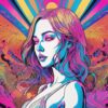 A close-cropped portrait of a woman’s face and upper torso is rendered in a vibrant, segmented color palette. The figure’s skin tones shift between Teal, Magenta, and Gold, delineated by bold Black linework. A swirling, organic halo of Pink and Purple surrounds her head, resembling a nebula or blooming flower. The lighting is diffuse, emanating from within the subject, creating a soft glow. The composition is symmetrical, with the woman’s gaze meeting the viewer’s directly, and the overall effect is one of intense, internal energy.