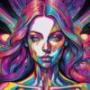 A centered portrait of a womanβs face, rendered in a hyper-saturated, digital painting style. Her skin is a cool Azure, contrasted by flowing Violet hair and a golden, biomechanical collar. Concentric rings of warm Orange, Magenta, and Teal radiate outward, suggesting energy or a blossoming aura. The face is highly symmetrical, with sharp cheekbones and intense, forward-gazing eyes. A small White circle rests on her forehead, acting as a focal point. The overall effect is a fusion of organic form and technological structure.