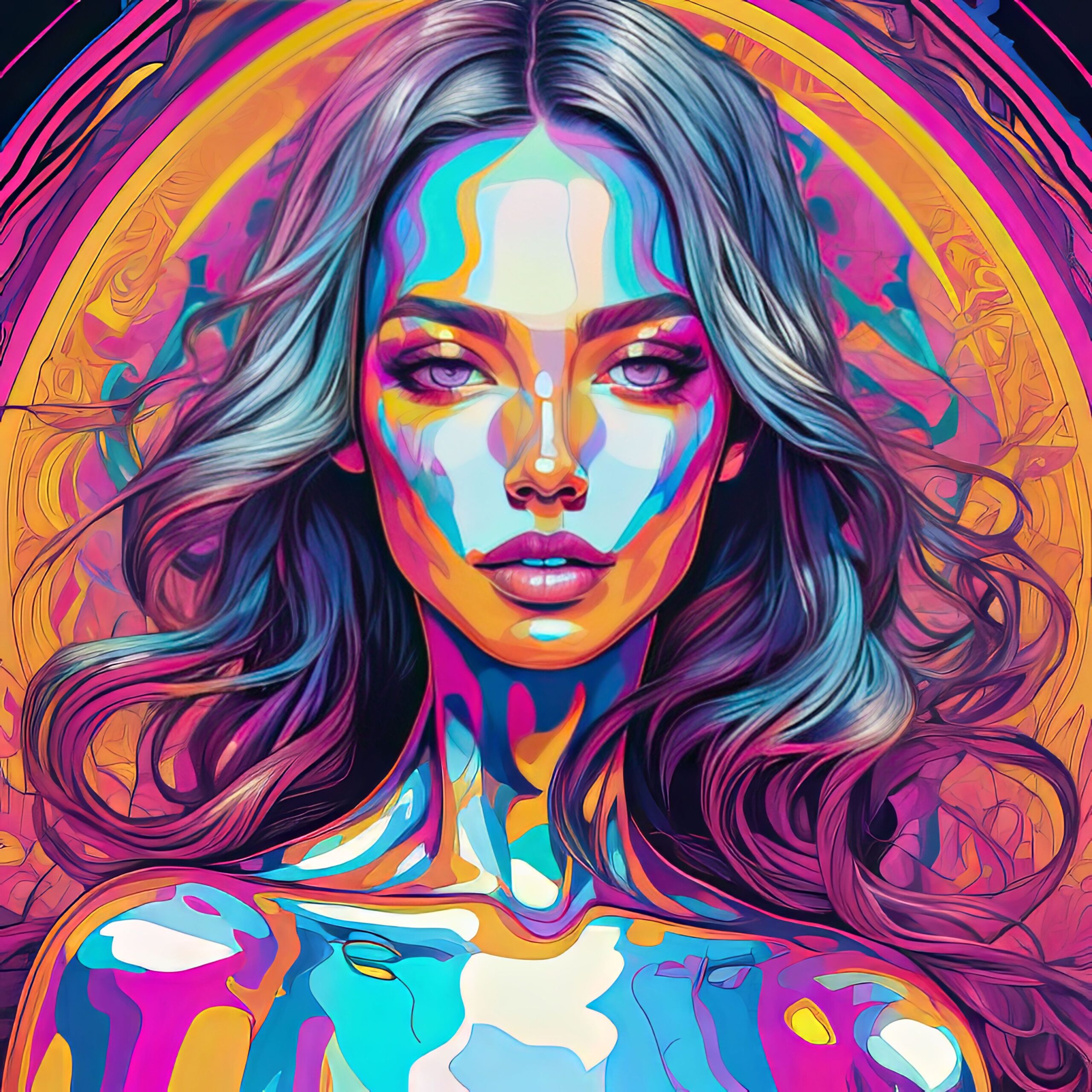 A tightly cropped portrait of a womanβs face and upper chest is rendered in a faceted, stained-glass style. The palette is intensely warm, dominated by Magenta, Teal, and Gold hues, with cool Lavender shadows defining bone structure. Hair flows in dynamic, curvilinear strands, contrasting with the geometric planes of the face. A circular halo of abstract, golden filigree frames the subject, suggesting a digital aura. The lighting is diffuse, emanating from multiple sources, creating a sense of inner luminescence. The overall effect evokes a hyper-real, synthesized beauty.