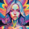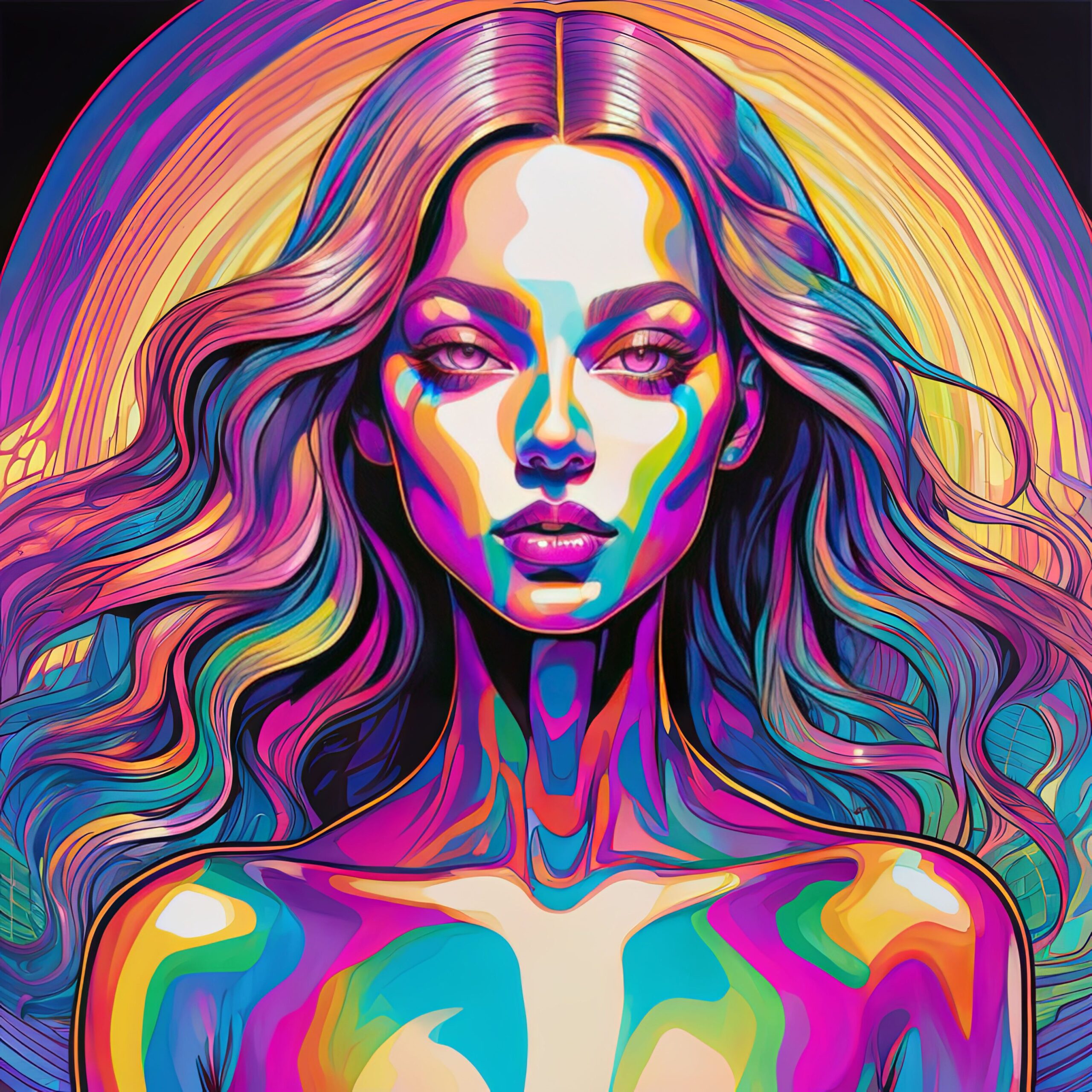 A symmetrical portrait of a womanβs face and upper torso is rendered in a fractured, mosaic-like style. Concentric rings of color radiate outward from the subjectβs face, resembling sound waves or a neural network. The palette is intensely warm, dominated by Magenta, Yellow, and Teal, with highlights of Royal and Asphalt. Smooth gradients define the facial features, contrasting with the jagged, almost crystalline texture of the surrounding energy field. The lighting appears to emanate from within the subject, creating a glowing effect.