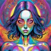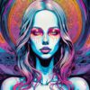 A tightly cropped portrait of a woman with piercing blue eyes dominates the frame, her face rendered with smooth gradients and sharp linework. Her flowing, layered hair explodes outward in a kaleidoscope of color, resembling both organic tendrils and fractured light. Behind her, a radiating burst of angular, ribbon-like forms in vivid Turquoise, Magenta, and Yellow creates a sense of dynamic energy. The palette is overwhelmingly warm, offset by the cool intensity of her gaze. Subtle floral motifs are embedded within the hair’s structure, hinting at growth and transformation.