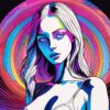 A close-cropped portrait of a woman with intensely blue eyes dominates the frame, her face rendered in a vibrant, almost liquid style. Thick, flowing lines of Royal and Magenta trace the contours of her features, resembling glowing circuitry or bioluminescence. The background explodes with swirling, organic forms in shades of Fuchsia, Yellow, and Navy, creating a sense of depth and movement. A subtle glossiness suggests a synthetic skin texture, contrasted by the sharp, angular definition of her jawline. The overall effect is a hyper-real, otherworldly beauty.