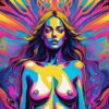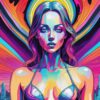 A symmetrical portrait of a woman with flowing, waist-length hair is centered against a swirling nebula background. The face is constructed from overlapping planes of color—Aqua, Lavender, and Rose—creating a fractured, almost holographic effect. Bold, Black outlines define the facial features and hair, contrasting with the soft gradients of the background. A luminous, pale Yellow halo encircles her head, and the overall lighting is cool and ethereal. The composition evokes a sense of otherworldly beauty and digital consciousness.