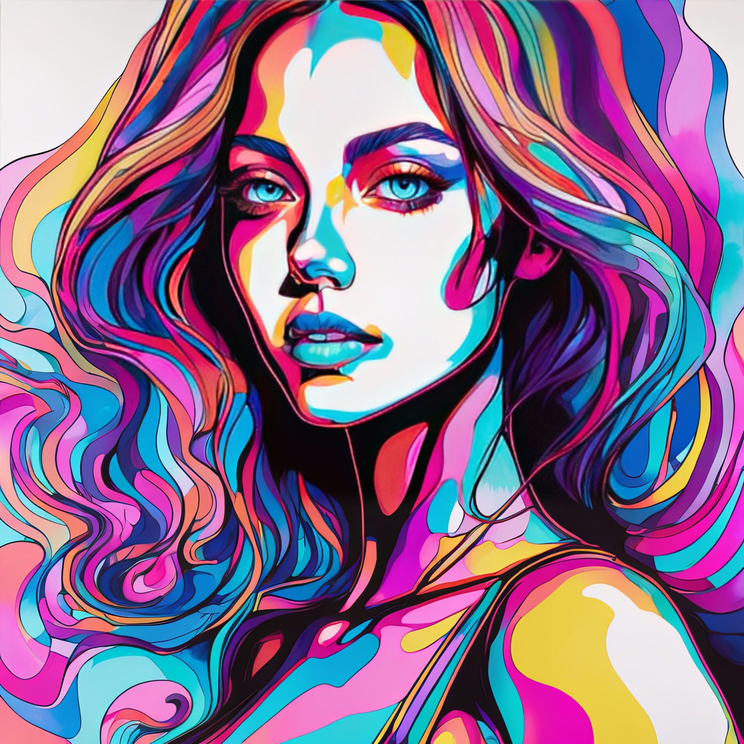 A tightly cropped portrait of a woman’s face is rendered in a mosaic of intensely saturated, flat color planes. The composition emphasizes flowing, curvilinear forms—particularly in the hair—that radiate outward like energy waves. Cool blues and violets dominate the shadows, contrasting with warm pinks and oranges in the highlights. The face itself is subtly geometric, with sharp angles defining the cheekbones and jawline. The overall effect is a psychedelic, almost bioluminescent quality, suggesting a consciousness visualized as pure color.