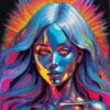 A tightly cropped portrait of a woman with flowing, long hair dominates the frame, rendered in a hyper-saturated palette of Teal, Magenta, and Lemon Yellow. Concentric, wave-like lines radiate outward from behind her head, suggesting energy or a halo. The face is highly stylized with sharp angles and defined shadows, contrasting with the organic curves of the hair. A warm, golden orb is partially visible in the upper left, providing a focal point. The overall effect is a vibrant, almost psychedelic depiction of a powerful, otherworldly being.