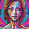 A close-cropped portrait of a woman with piercing blue eyes dominates the frame, her face subtly shadowed and highlighted. Radiating from her head is an explosion of swirling, organic forms resembling both hair and nebulae, rendered in a vibrant, high-contrast palette. The background is a chaotic yet harmonious blend of magenta, teal, and gold lines, creating a sense of energetic expansion. She wears a minimalist, silver bralette, its metallic sheen contrasting with the soft, illustrative style of the surrounding forms. The overall effect evokes a feeling of consciousness unfolding.