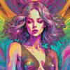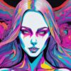 A tightly cropped portrait of a womanβs face is rendered in a fractured, psychedelic style. Her skin tones shift through gradients of Lime, Orange, and Violet, outlined by bold Black linework. White, flowing hair contrasts sharply with the warm, saturated palette. A swirling, abstract background echoes the facial contours, creating a sense of energy radiating outward. The eyes, a piercing Sky Blue, are the focal point, suggesting intelligence and depth. The overall effect is a hyper-stylized, almost bioluminescent depiction.