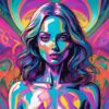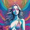 A close-cropped portrait of a woman with flowing, indigo hair dominates the frame, her gaze direct and arresting. Her skin is rendered in cool, luminous cyan, contrasting sharply with the warm, psychedelic burst of color radiating outwards like petals. The background is a swirling vortex of magenta, gold, and electric blue, suggesting a nebula or internal energy field. Fine linework defines the facial features and hair strands, while the body is simplified into smooth, organic forms. The overall effect is a vibrant, otherworldly depiction of feminine power and consciousness.