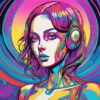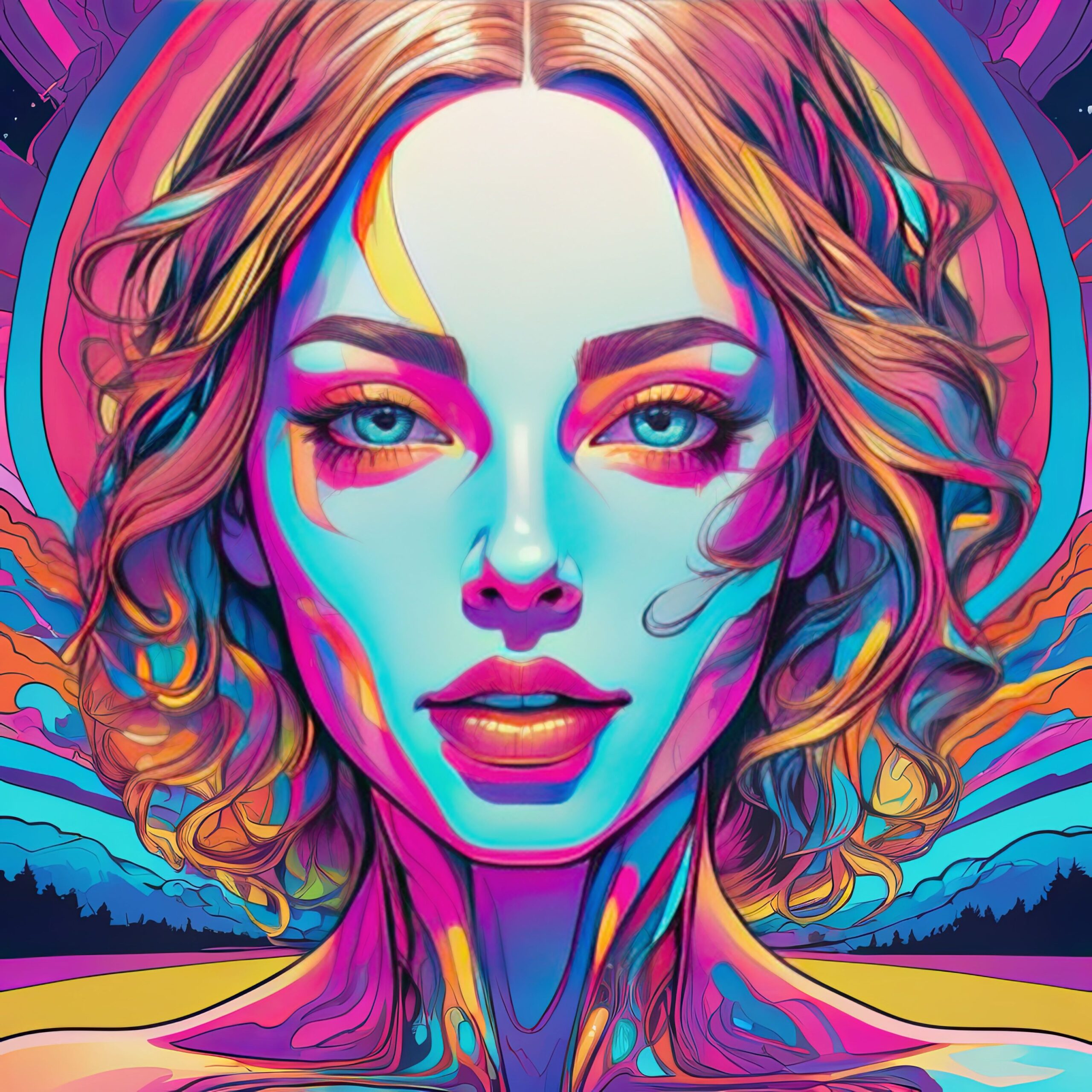 A tightly cropped portrait of a womanβs face dominates the frame, rendered in a swirling, psychedelic style. Bold, angular brushstrokes define her features, with a cool palette of Teal and Navy for the skin tones contrasted by warm Fuchsia and Gold highlights. Her piercing blue eyes are the focal point, set against a backdrop of abstracted, flowing forms resembling both hair and cosmic energy. The composition evokes a sense of internal illumination, as if the subject is radiating light and thought. A dark silhouette of a mountainous landscape anchors the bottom of the image.