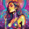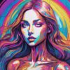 A symmetrical portrait of a woman with flowing, waist-length hair dominates the frame, her gaze direct and arresting. Her skin tones shift through gradients of Magenta, Teal, and Rose, echoing the swirling, cloud-like forms that extend outward like wings. A radiant Yellow halo encircles her head, casting a soft glow. The background is a deep Asphalt, creating a strong contrast with the vibrant figure. Fine linework defines the hair and facial features, while the overall texture suggests a digital painting with a slightly painterly quality. The composition evokes a sense of otherworldly serenity.