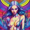 A symmetrical portrait of a womanβs face is centered, radiating outward with concentric circles of swirling, psychedelic color. Her skin is a cool, electric Blue, overlaid with fractured planes of Magenta and Gold. Intense, amber eyes lock with the viewer. The background is a dense, organic tangle of Purple and Teal forms, resembling both deep-sea life and galactic clouds. Soft, pink tendrils frame the upper corners, contrasting with the sharp, angular definition of her jawline. The overall effect is a luminous, otherworldly presence.