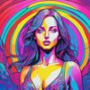A close-cropped portrait of a woman with long, flowing hair is enveloped in concentric, swirling bands of color. The palette is intensely saturated, shifting from cool Teal and Royal around the face to warmer Magenta and Yellow in the outer layers. Fine, almost calligraphic linework defines both the hair and the abstract forms, creating a sense of organic energy. The womanβs gaze is direct, her expression serene, set against a dark, undefined background. The overall effect evokes a psychedelic aura, a blossoming of consciousness.