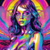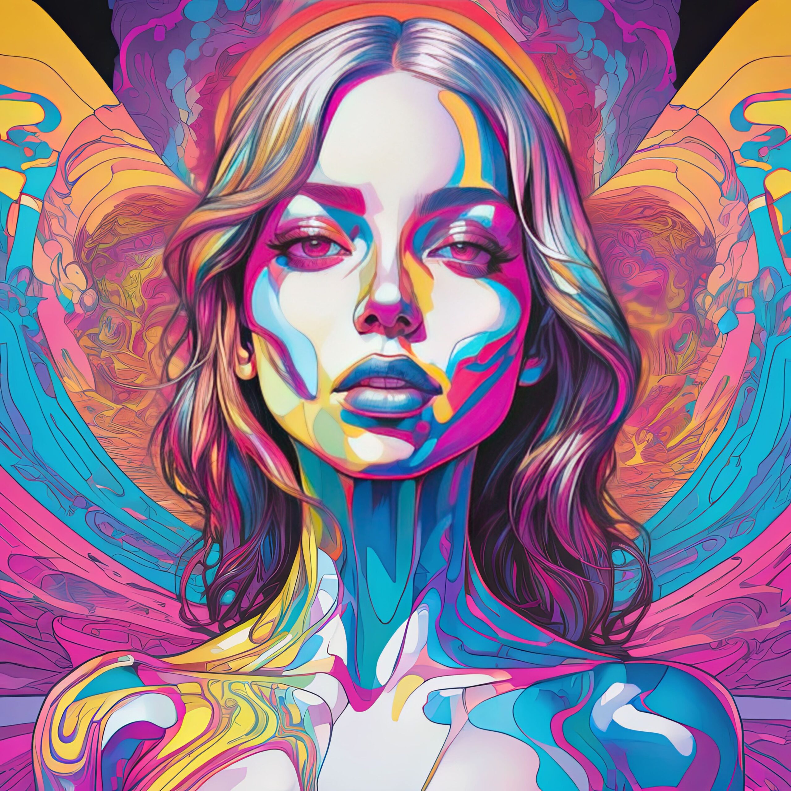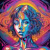 A symmetrical portrait of a womanβs face is fractured into planes of intense, saturated color. Cool Turquoise and Royal blues define the neck and shoulders, transitioning to warm Magenta and Yellow hues across the face. A golden, halo-like shape frames the head, echoing the swirling, organic patterns that radiate outward. The effect is reminiscent of stained glass or a digital glitch, with sharp linework and a high-contrast palette. The womanβs expression is direct, her gaze unwavering. The texture appears smooth, almost polished, despite the complex layering.