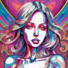 A close-cropped portrait of a woman with piercing blue eyes dominates the frame, her face rendered in sharp, angular linework. Swirling, psychedelic waves of color—Magenta, Teal, Yellow, and Violet—emanate from behind her head, resembling both hair and a cosmic nebula. Cool, directional lighting sculpts her cheekbones and jawline, contrasting with the warm, saturated palette of the surrounding energy. The effect is a dynamic interplay between a defined human form and an amorphous, otherworldly aura. A hint of a dark strap is visible on her shoulder.