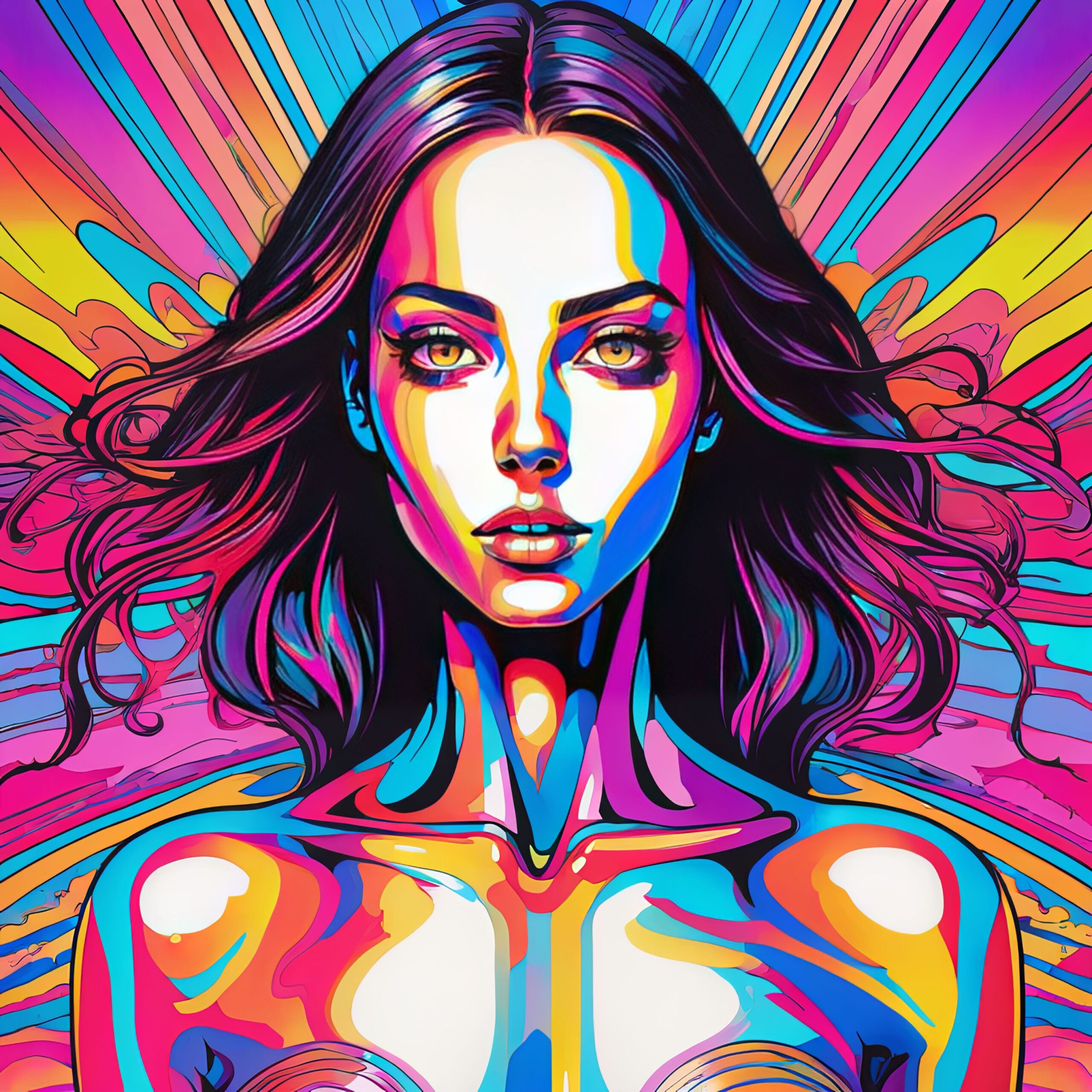 A symmetrical portrait of a woman with flowing dark hair is centered against a radiating burst of color. The face, rendered with sharp angles and defined cheekbones, possesses a cool, almost porcelain complexion. Below the neck, the figure dissolves into a complex network of interlocking, biomorphic shapes in warm hues—pinks, oranges, and yellows—suggesting circuitry or organic growth. The background flares with analogous colors, creating a halo effect. Strong black linework defines the facial features and the edges of the abstract forms, enhancing the contrast between the organic and the mechanical.