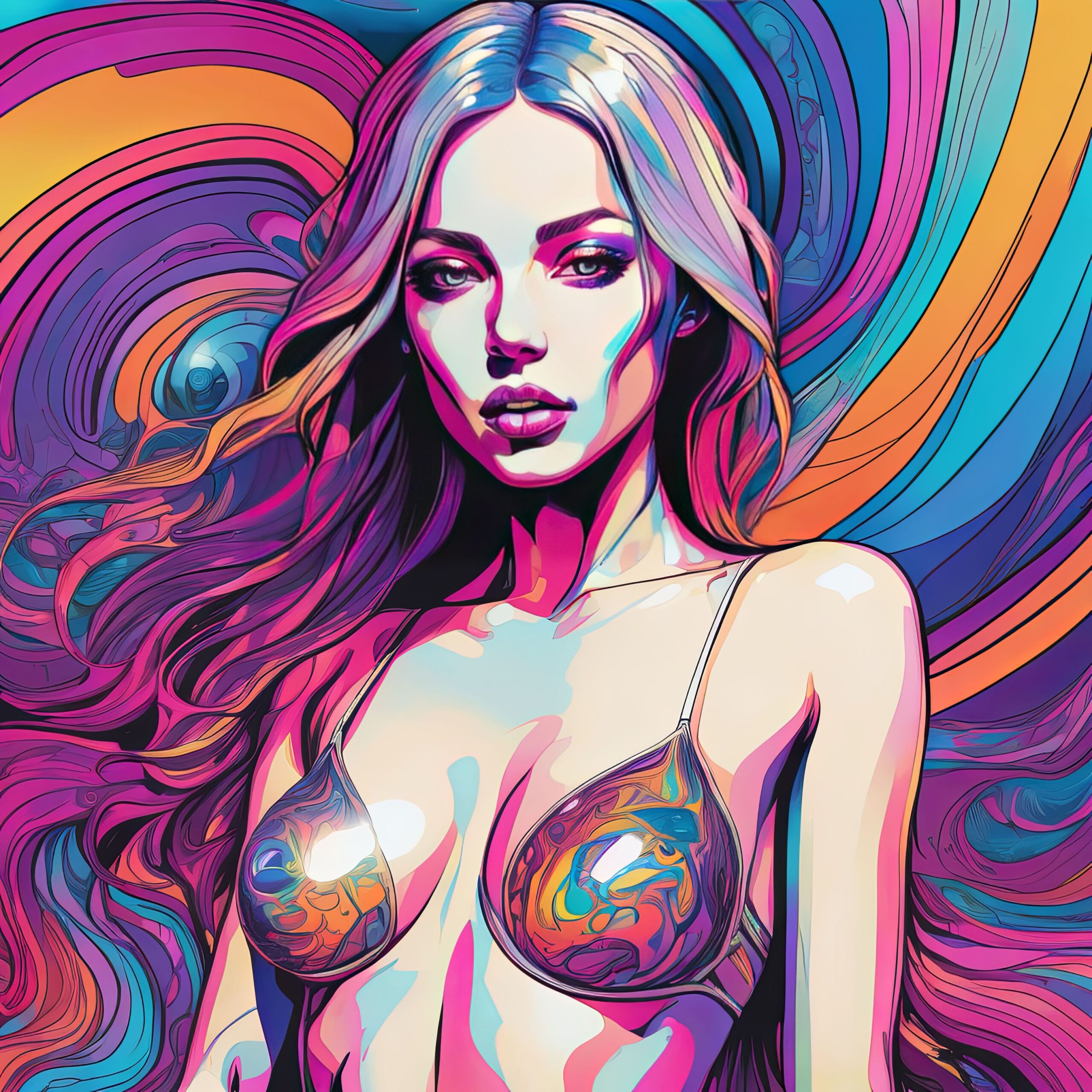 A close-cropped portrait of a woman with flowing, silver hair dominates the frame, her gaze direct and slightly aloof. She wears translucent, swirling bra cups that echo the radiating, concentric wave patterns behind her. The palette is intensely saturated—Magenta, Turquoise, and Gold—with sharp Black outlines defining forms. A warm, directional light sculpts her face and shoulders, contrasting with the cool, flat tones of the background. The overall effect is a fusion of organic curves and mechanical precision, suggesting a mind expanding outward.