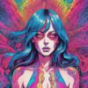 A symmetrical portrait of a womanβs face is fractured into radiating bands of color, resembling a psychedelic bloom. Cool blues and violets dominate the outer rings, warming to yellows and pinks at the core, highlighting the face. Fine, dark linework defines the facial features and hair, contrasting with the smooth, gradient fills. The overall effect evokes a sense of expanding consciousness and digital distortion, with a subtle, watery texture throughout. Light appears to emanate from the center, creating a halo effect.