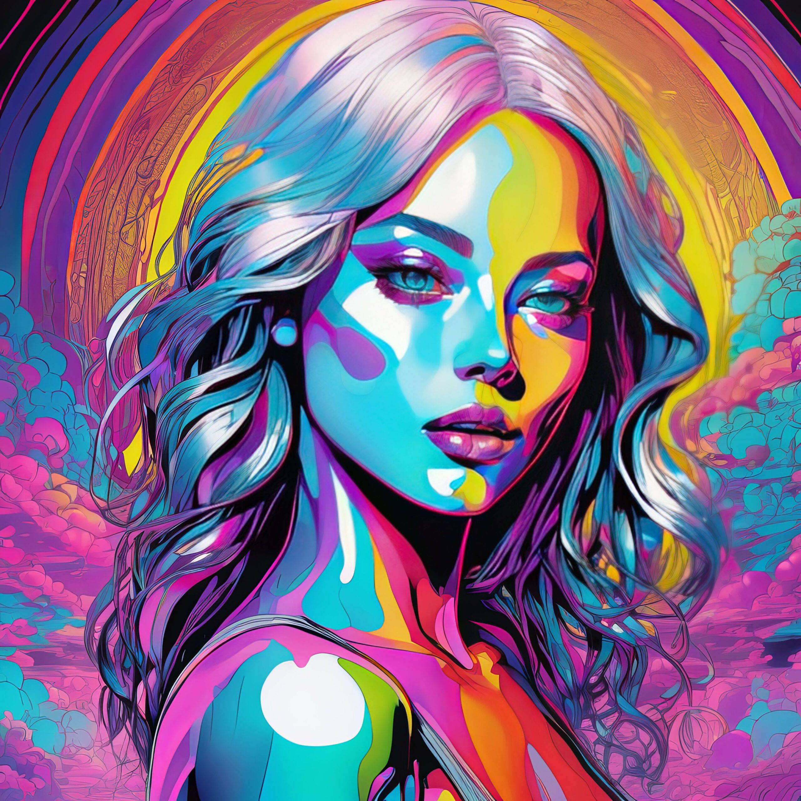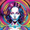 A close-cropped portrait of a womanβs face is fractured into planes of vibrant color, resembling a stained-glass window or a digital glitch. Cool Turquoise and Royal Blue dominate the skin tones, offset by warm Magenta and Gold highlights. Concentric rings radiate outward from her head, suggesting an expanding aura. The hair is rendered as flowing, angular lines, contrasting with the soft curves of her face. A circular, White highlight rests on her collarbone. The overall effect is a dynamic interplay of organic form and synthetic texture.