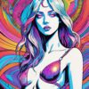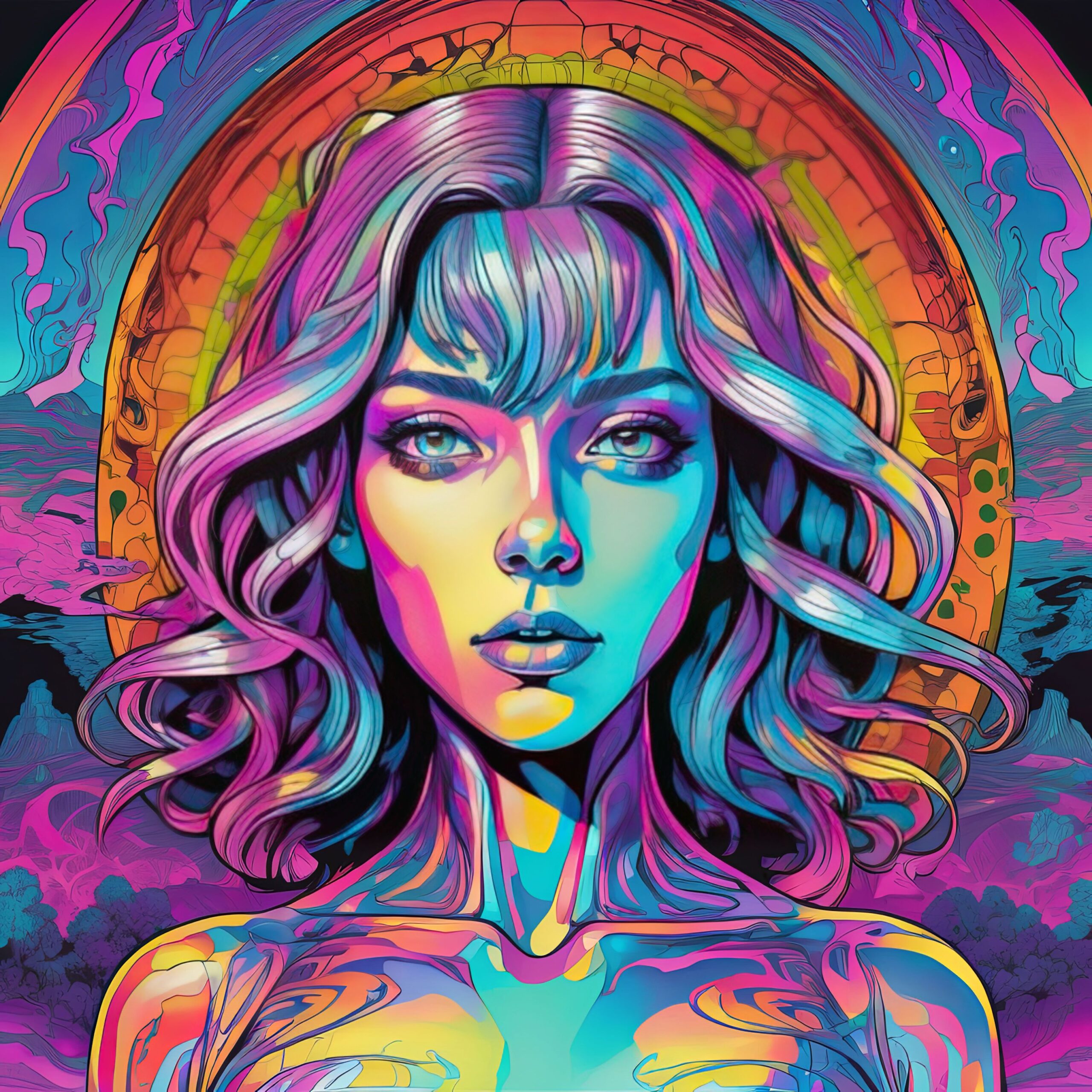 A close-cropped portrait of a woman with piercing grey eyes dominates the frame, her face rendered in a hyper-saturated palette of Teal, Magenta, and Violet. A complex, cracked circular form, resembling a stained-glass window or a planetary cross-section, radiates behind her head, its warm Orange and Yellow hues contrasting with the cool tones of her skin. The womanβs hair flows in soft, undulating waves, while sharp, angular lines define the geometric halo. The overall effect evokes a sense of digital consciousness and internal complexity.