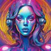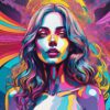 A close-cropped portrait of a womanβs face and upper torso dominates the frame, rendered in a vibrant, almost psychedelic style. Her skin is faceted with planes of color β Teal, Magenta, and Royal β creating a stained-glass effect. Long, flowing hair, a cascade of Purple and Gold, whips around her head, merging into swirling, organic forms that fill the background. A faint skull shape is embedded within the hairβs texture. The lighting is dramatic, with strong highlights and shadows emphasizing the angularity of her features. The palette is overwhelmingly warm, yet balanced by cool undertones in the shadows.