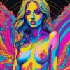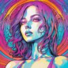 A tightly cropped portrait of a woman with a direct gaze dominates the frame, her features rendered in a mosaic of vibrant, overlapping color fields. Concentric arcs of saturated hues—Magenta, Teal, Yellow, and Lime—radiate outward from her head, suggesting a blossoming energy. The linework is precise and flowing, creating a sense of both structure and organic movement. A cool, violet shadow defines the planes of her face, contrasting with the warm, almost psychedelic palette. The overall effect evokes a digital aura, a portrait of consciousness visualized as pure light.