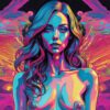 A tightly cropped portrait of a woman’s face and upper chest radiates with a fractured, kaleidoscopic energy. The skin tones are rendered as blocks of intense, saturated color—Magenta, Cyan, Yellow, and Orange—creating a stained-glass effect. Her piercing blue eyes are the focal point, set within a symmetrical composition. Flowing, ginger-toned hair fans outwards, echoing the swirling, abstract forms that fill the dark background. A subtle gloss suggests a wet-paint texture, contrasting with the sharp, defined edges of the color fields. The overall effect is a vibrant, otherworldly depiction of consciousness.