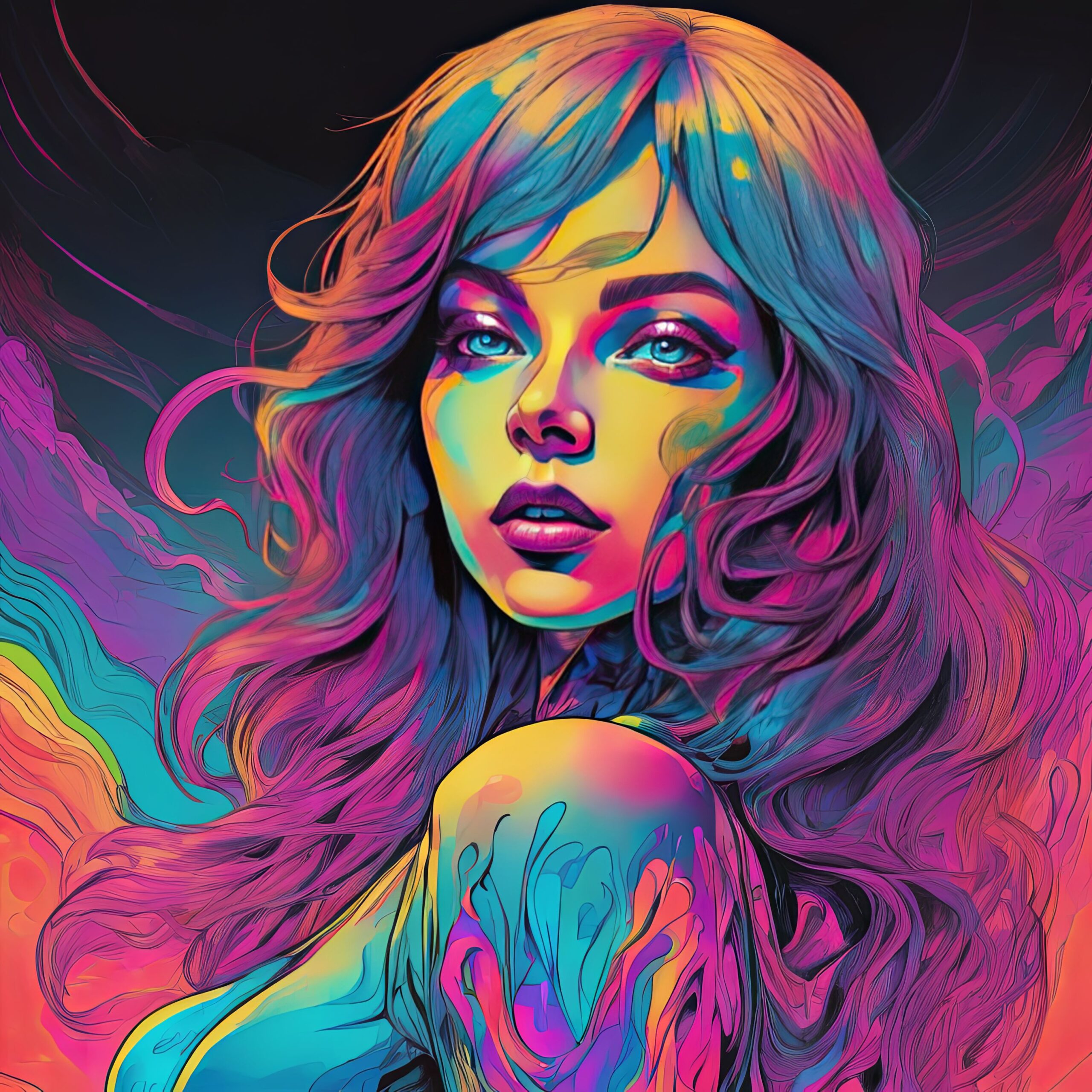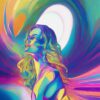 A close-cropped portrait of a woman with flowing, iridescent hair dominates the frame, her gaze direct and slightly melancholic. Her skin tones shift between warm peach and cool lavender, mirroring the swirling nebula-like forms that emanate from her shoulders. The hair is a cascade of textured lines in shades of Royal, Magenta, and Teal, suggesting both organic growth and digital distortion. A translucent orb, containing a complex, root-like structure, rests in her hands, illuminated from within. The background is a deep Asphalt, creating a strong contrast and emphasizing the subject’s luminosity.