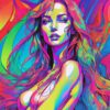 A tightly cropped portrait of a womanβs face dominates the frame, rendered in a swirling, almost liquid mosaic of color. The palette is intensely warm, shifting from Magenta and Rose to Gold and Peach, bisected by cool Cyan highlights in the eyes and along the jawline. Fine, energetic linework suggests hair strands and facial contours, creating a sense of movement. The background is a blurred, layered landscape of analogous hues, evoking a sunset or nebula. The overall effect is a hyper-saturated, dreamlike state, where the figureβs form seems to dissolve into pure energy.