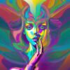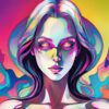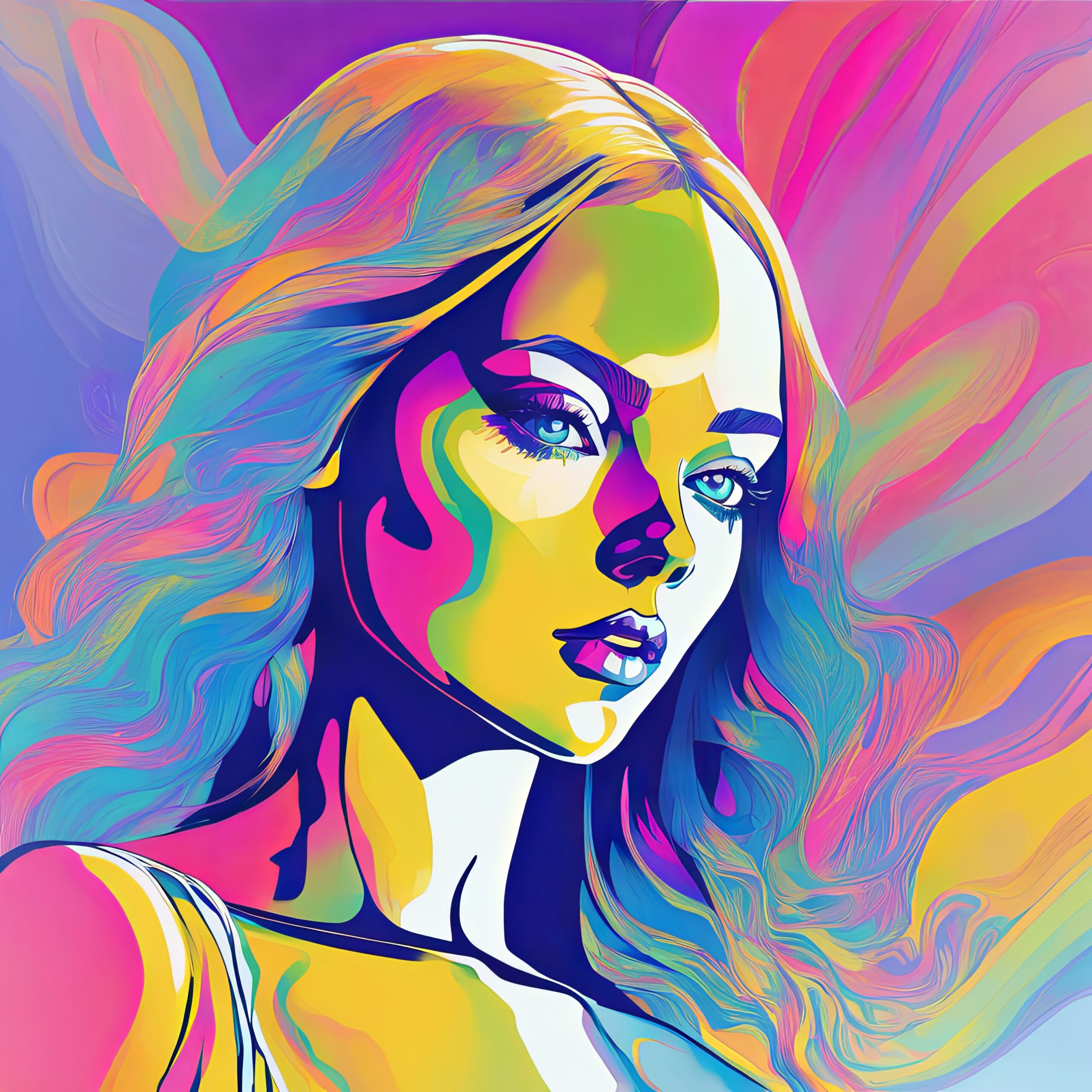 A close-cropped portrait of a woman’s face is rendered in a swirling, psychedelic style. Bold, flat planes of color—Yellow, Magenta, Teal, and Royal—define her features, creating a stained-glass effect. Her eyes, a piercing Azure, are the focal point. The background explodes with undulating, ribbon-like forms that echo the contours of her hair, suggesting motion and energy. A warm light source appears to originate from the left, casting dramatic shadows and highlighting the glossy texture of the skin. The overall impression is one of vibrant, internal life.