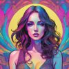 A symmetrical portrait of a womanβs face is rendered in flat, vibrant planes of color, resembling stained glass. The background swirls with liquid-like forms in a hot palette of Magenta, Orange, and Teal. Sharp Black outlines define the facial features and hair, creating a graphic contrast against the soft, blended gradients of the skin tones. The eyes, a piercing Cyan, are the focal point, drawing the viewer into a hypnotic gaze. The composition evokes a sense of energy and transformation.